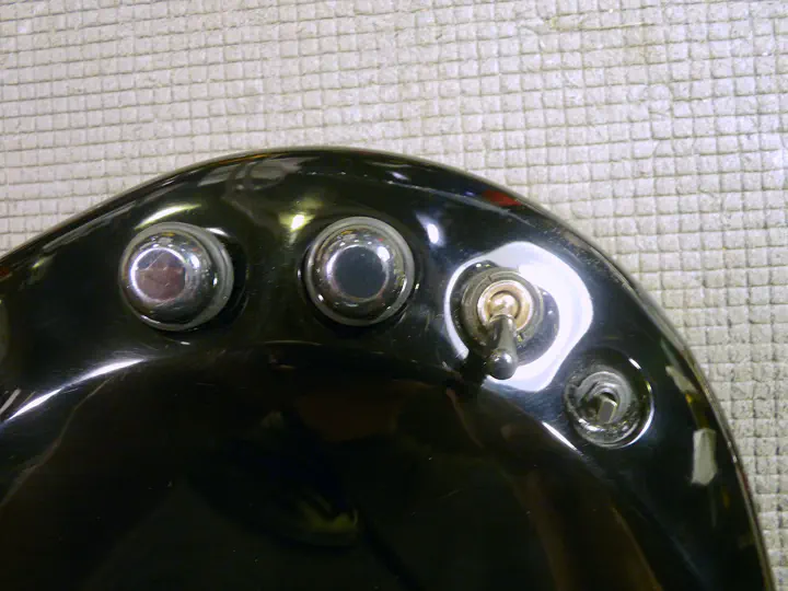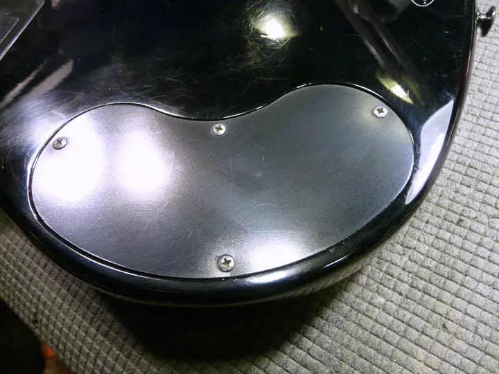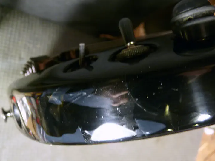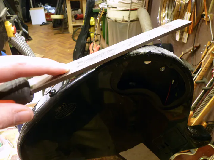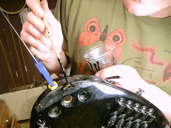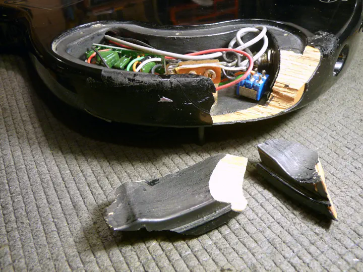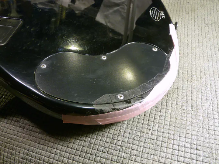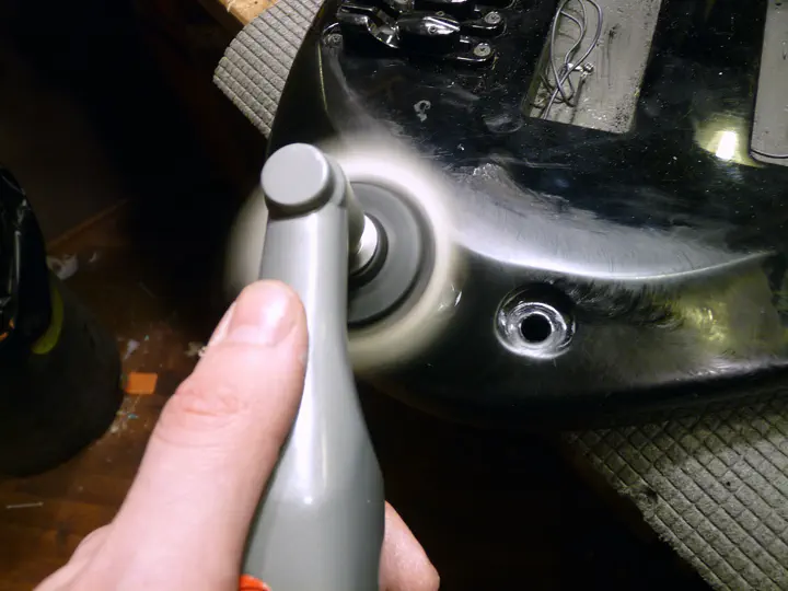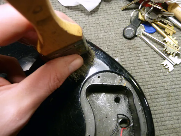 Тут возникла неожиданная проблема: на поцарапанном и побитом корпусе отремонтированная область стала слишком сильно блестеть. Пришлось немножко состарить поверхность. Крупные царапины делаются ключами, мелкие - жесткой кистью, которая тыкается в гитару, как карандаш, в разных местах. Оба метода обеспечивают достаточно хаотичные царапинки.