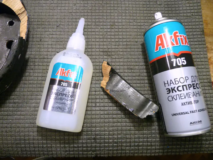 Убедившись, что отломанные деревяшки не обязательно вставлять обратно по отдельности, склеиваю их вместе. Для мелочей, которые неудобно стягивать струбцинами, отлично подходит мездра или суперклей. С мездрой было лень возиться. Густой цианоакрилат с активатором позволяет получить исключительно прочное соединение за пару минут, но требует очень точного позиционирования деталей в первые секунды склейки.
