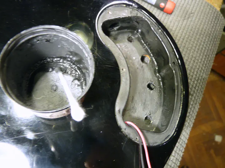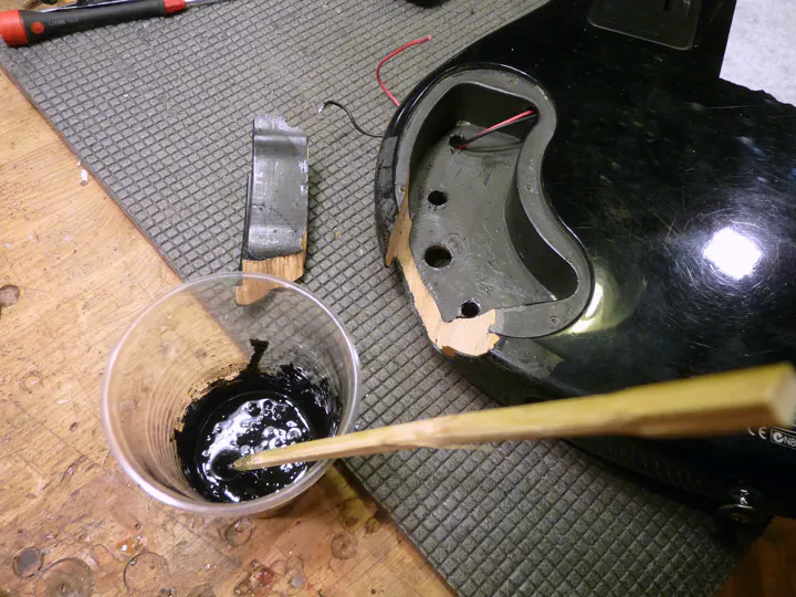 Поскольку сколы на гитаре расположены с разных сторон, эпоксидка постоянно растекается. Одно из решений - подогревать небольшие порции смолы на горелке и тут же, в ближайшие секунды, наносить ее на нужную область. Прогретая смола застывает буквально за полминуты и более не двигается.