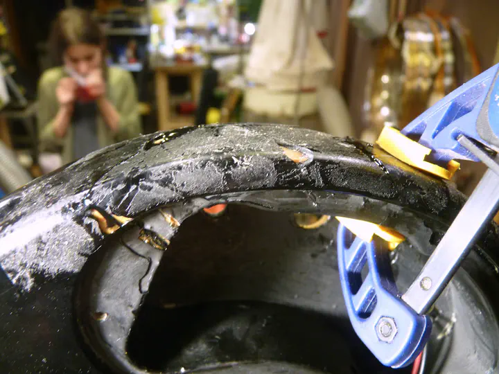 Сначала все швы вымазываются эпоксидкой и детали прихватываются легкой струбциной.