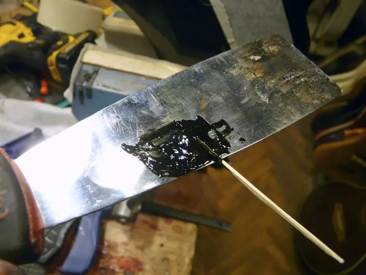 Для следующей склейки я использовал эпоксидку, подкрашенную до густого черного цвета. Причина в том, что ЛКП по периметру швов осыпалось, а толщина у него огромная. Помимо склеивания деревяшек, смола загрунтует сколы. Кроме того, она нечувствительна к толщине шва, что в данном случае ценно, потому что стянуть детали толком не получится.