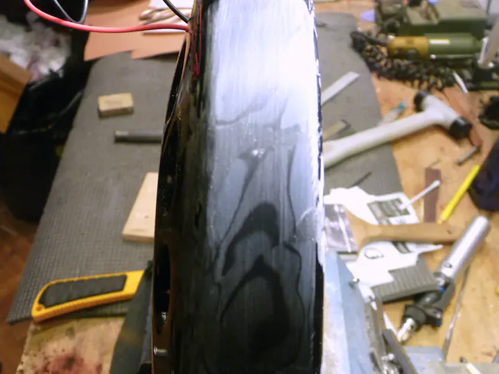 Затем я заливаю пресловутые сколы. Надо быть готовым к тому, что позднее на отшлифованной поверхности эпоксидки появятся крошечные выщерблины - мельчайшие пузырьки, застывшие в смоле. Избавиться от них очень сложно, на ум приходит разве что вакуумная камера (которой у меня нет). Пузыри на поверхности заливки легко убрать распылением спирта, однако после шлифовки даже на полмиллиметра вглубь все равно вылезут новые. С другой стороны, эти пузыри не особо заметны даже без дополнительной грунтовки, а уж любой грунт поверх эпоксидки их легко спрячет.
