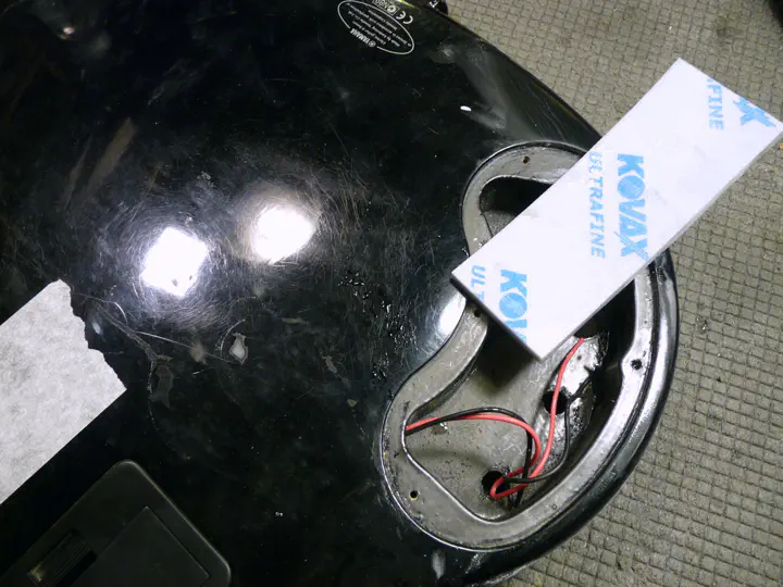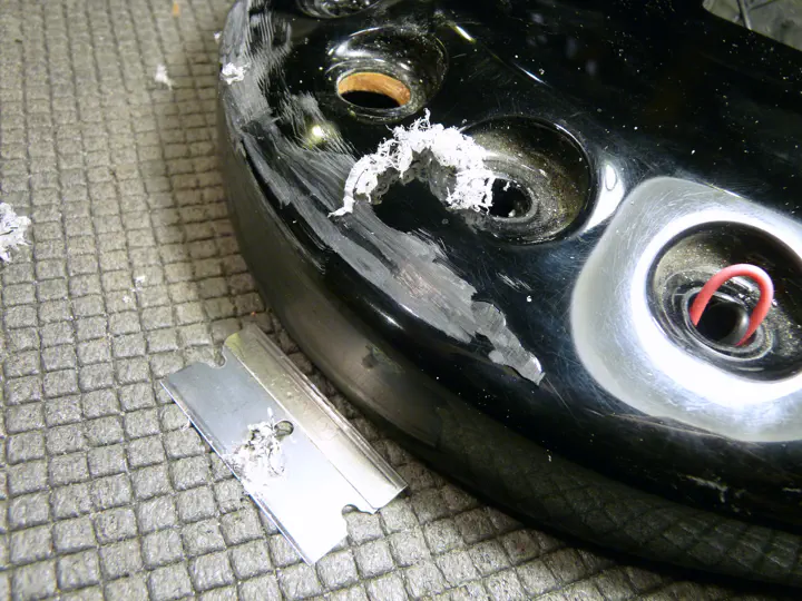 При мелкой шлифовке (порядка P400) становятся заметны переходы между слоями родного ЛКП. Избежать их трудно, если не невозможно, - хотя бы потому что склеенные куски чуть расходятся, и от этого никуда не деться. На фото хорошо заметна линия склейки.