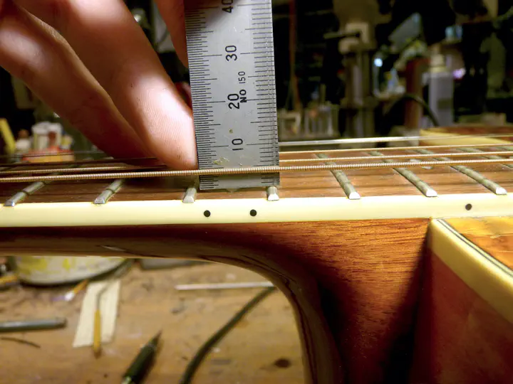 Простейший и самый распространный вариант решения этой задачи - уменьшить высоту косточки (то бишь нижнего порожка). Но на данной гитаре это не сработает: косточка и без того низкая. Если ее подточить, она сравняется с подставкой и струны на ней просто не перегнутся.