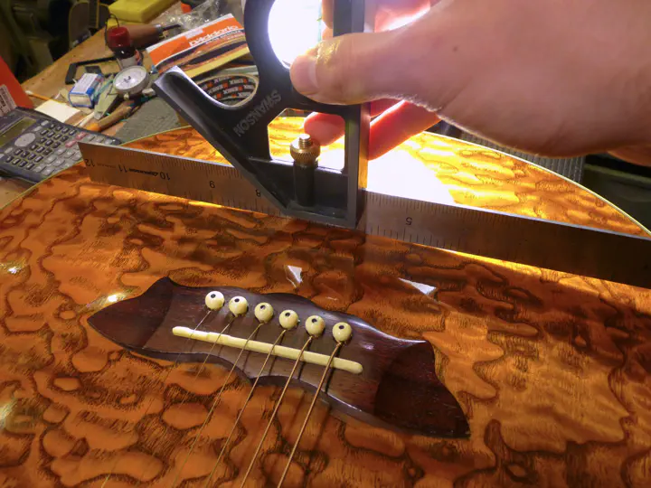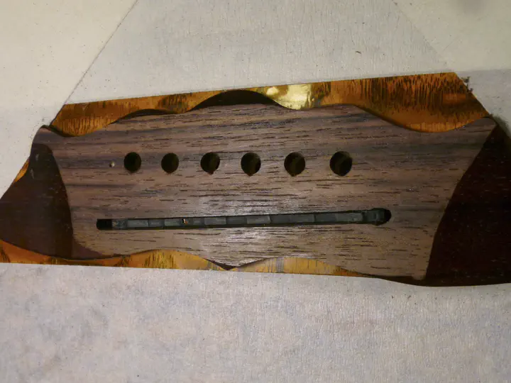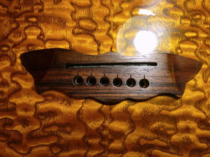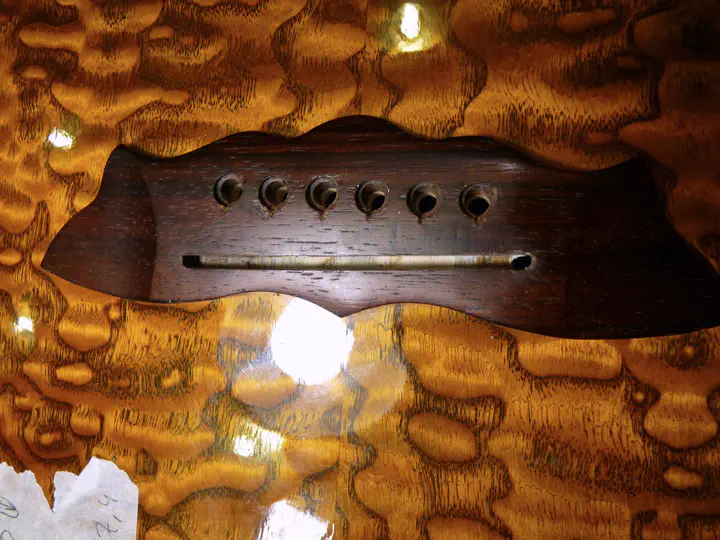 После рубанка все как обычно: мягкие шкурки, рассверливание отверстий под пины, еще немножко шлифовки и воск. В данном случае я добавил также небольшие углубления под струны, чтобы увеличить их угол перегиба на пороге.