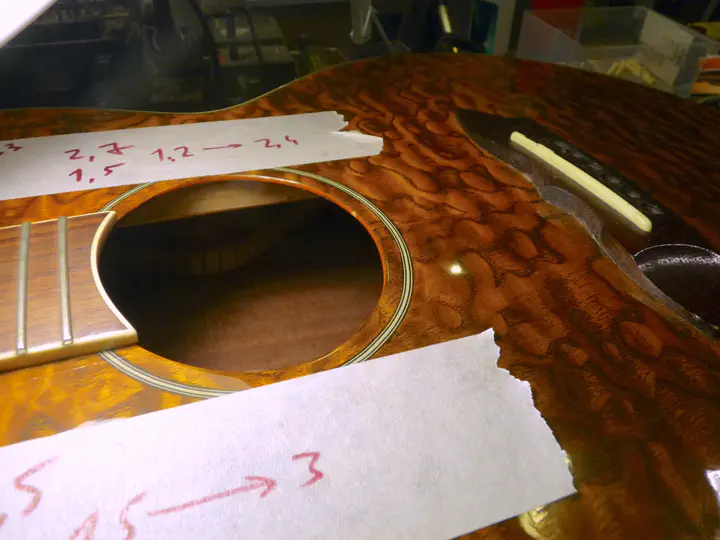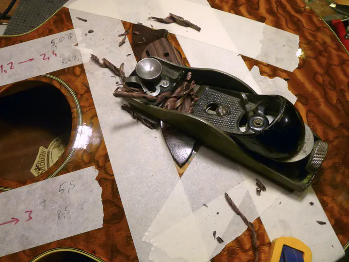 Дно паза коснулось деки, хотя со стороны тонких струн осталось немного палисандра: