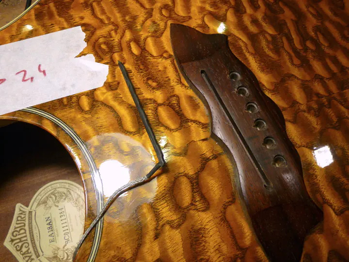 Итак, нужно опустить струны. Гриф прямой, верхний порожек подпилен. Менять угол грифа на акустике с вклеенным грифом - крайняя мера, здесь не целесообразная. Остается править высоту струн на бридже.