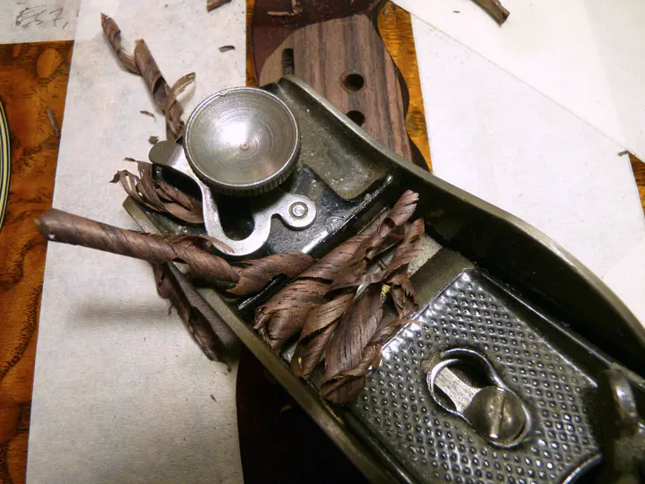 Надо присматривать за направлением волокон и задирами на древесине. Неверное направление рубанка в сочетании с косослоем может жутко рвануть деревяшку и даже чего-нибудь от нее отколоть. Но тут все идет как по маслу.