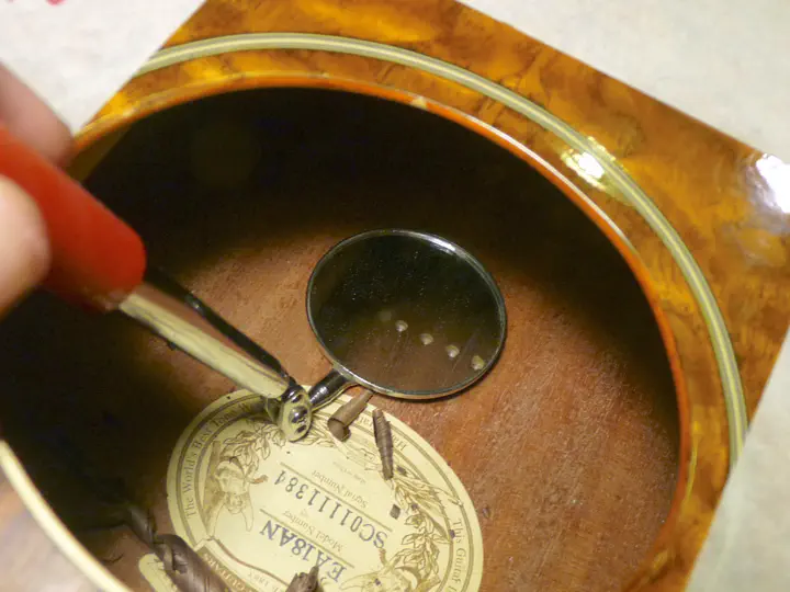 Внезапно докапываюсь до белой точечки (слева от отверстия первой струны):