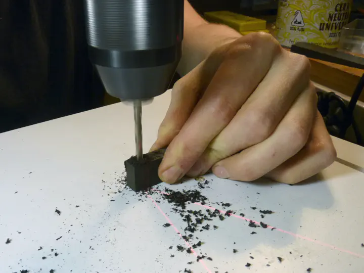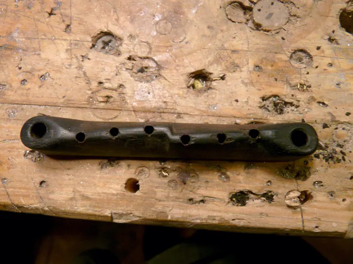 Теперь сверлом 2,5 осторожненько засверливаюсь миллиметров на 5-7, т.е. глубоко, но не насквозь. Сколы по краям отверстий в данном случае неизбежны, но это черное дерево, и на нем замаскировать такие дефекты легко.
