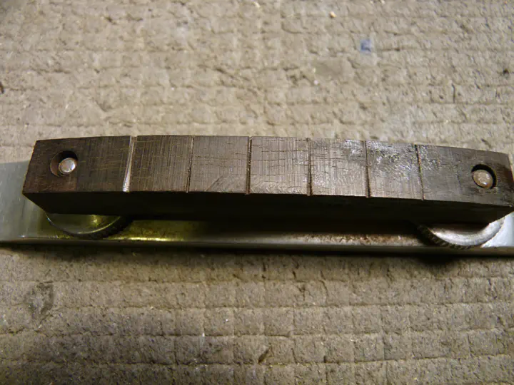 Установил бридж на гитару, пропилил прорези под струны. Латунька под первой струной уползла в сторону, видимо, при сверлении - ну да и бог с ней, это ни на что не влияет.