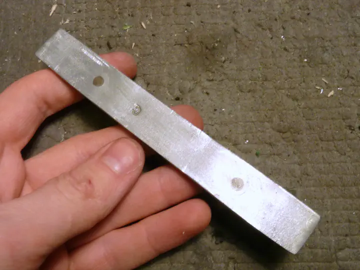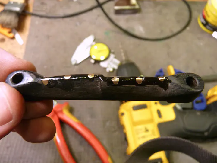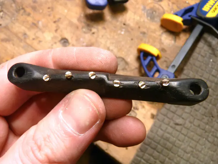 Вдавливаю в отверстия латунный пруток соответствующего диаметра и обрезаю его вровень с поверхностью. То, что выглядит как шлицы, на самом деле - следы от кусачек.