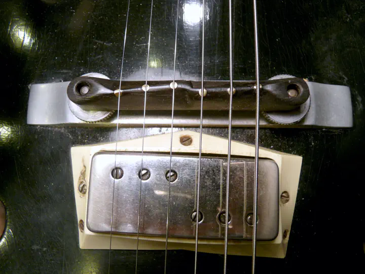 Потрепанный, из красного дерева, без всякой компенсации мензуры, сидит на шпильках с регулировочными гайками. Шпильки приходят в алюминиевое основание. На подошву последнего толстым слоем наклеен какой-то зеленый войлок. По краям подошвы на зеленый войлок наклеены кусочки резины. Ими бридж и опирался на деку. В общем, все очень запущено…