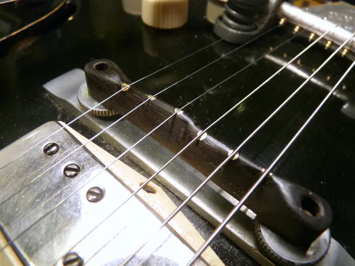 Причем под тонкими струнами все замечательно - они гладкие. А вот обвивка толстых струн сработала как напильник. Шестая струна ушла вниз на миллиметр.