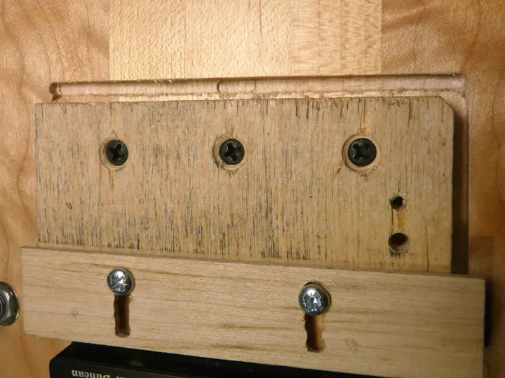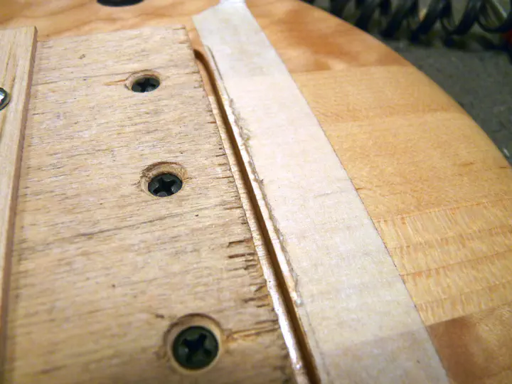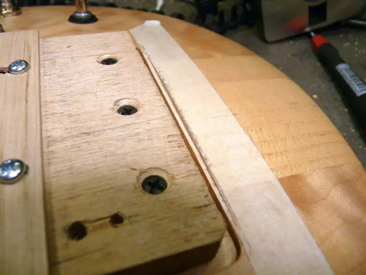 Вместо того, чтобы ковырять край паза стамеской или бормашиной, я за пять минут соорудил вот такую конструкцию из обрезков фанеры и клена. Сажается она прямо на штатные крепежные отверстия бриджа. Два маленьких шурупчика фиксируют дощечку в нужном положении.