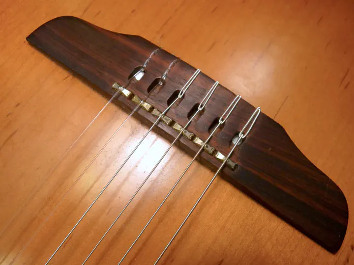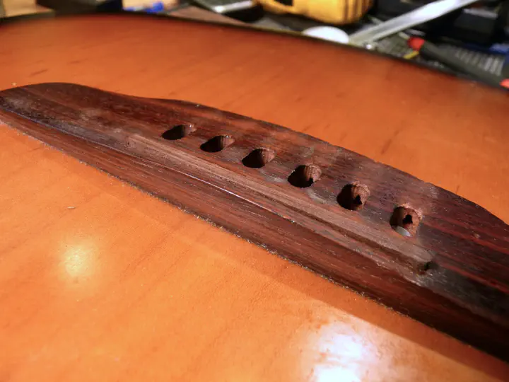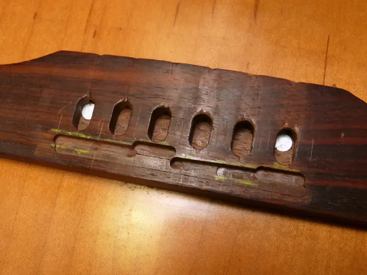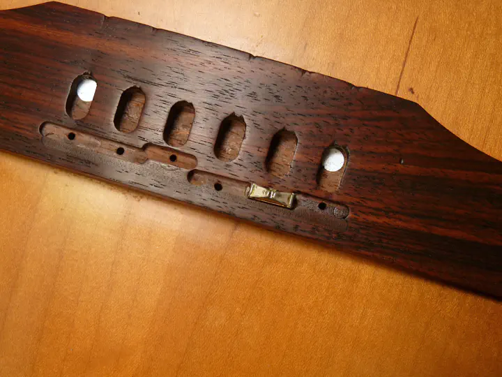 Первым делом проверяю верхний порог и прогиб — там все в порядке. На струны и лады тоже пожаловаться трудно. Значит, проблема в мензуре. Точнее, в положении седел бриджа.
