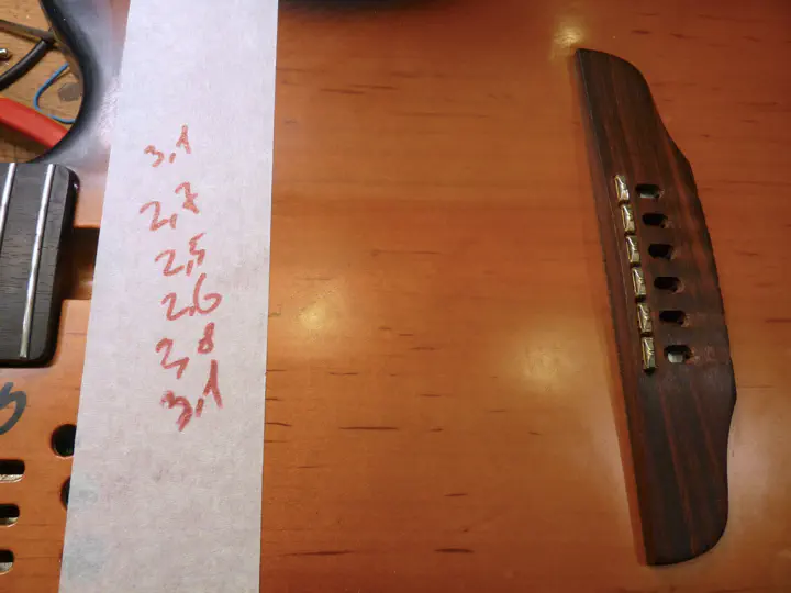 Высотой струн владелец доволен, ее нужно сохранить. Значит, нужно как-то отметить нынешнюю высоту. Тут много вариантов, что и откуда измерять. Я в данном случае измерил расстояние от поверхности подставки до верхней кромки каждого седла. Результат записан рядышком. Да, я всегда все пишу на гитаре :)