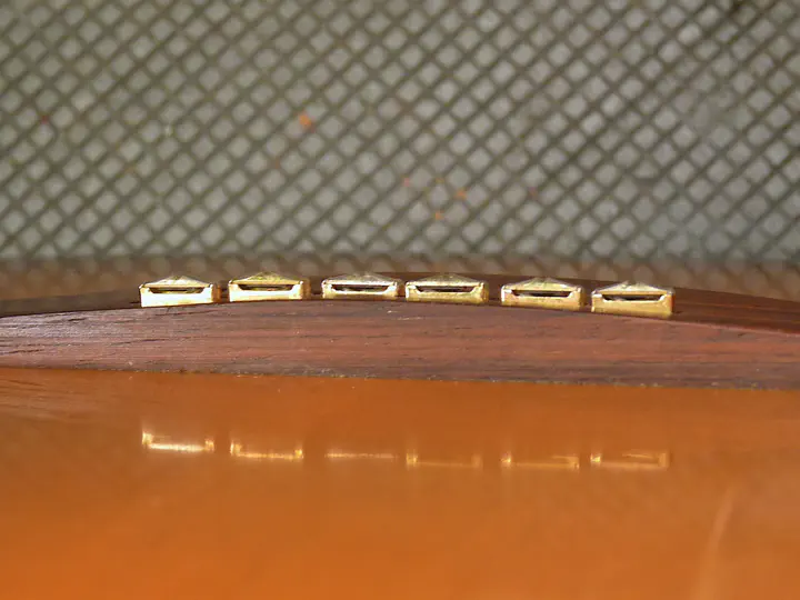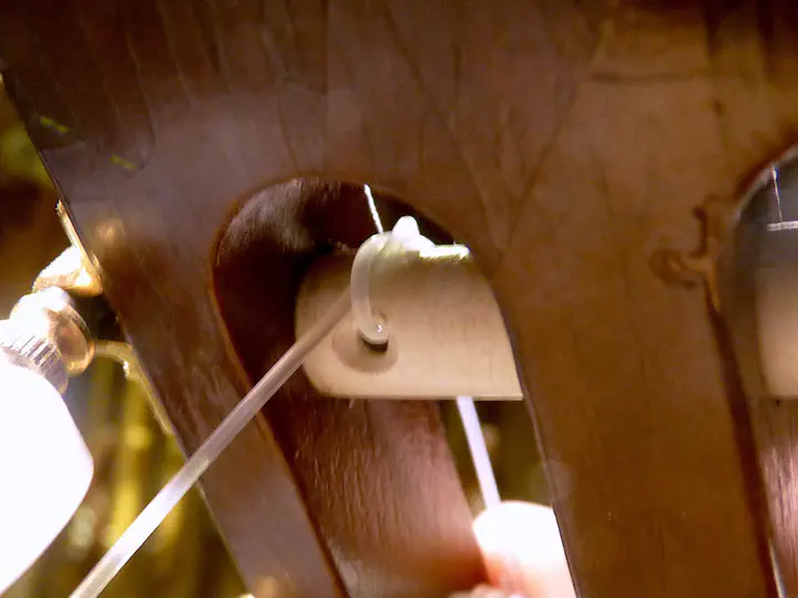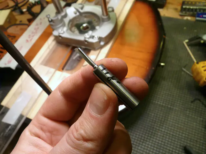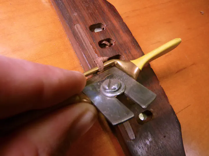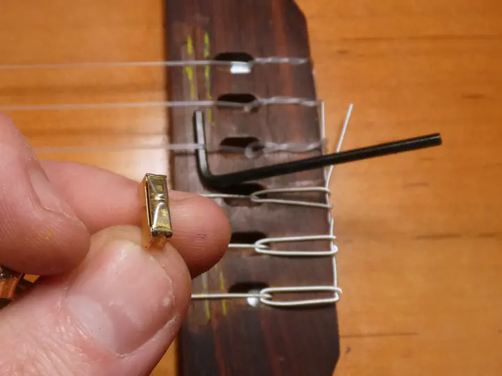 На третьей и четвертой струне высота должна быть ближе к 2,5, чем к 3 мм, поэтому палочку я вынимаю и вставляю вместо нее ключ на 2,5, после чего повторяю процедуру. Да, под струной плоскость, но оригинальный порожек тоже ее не лишен: