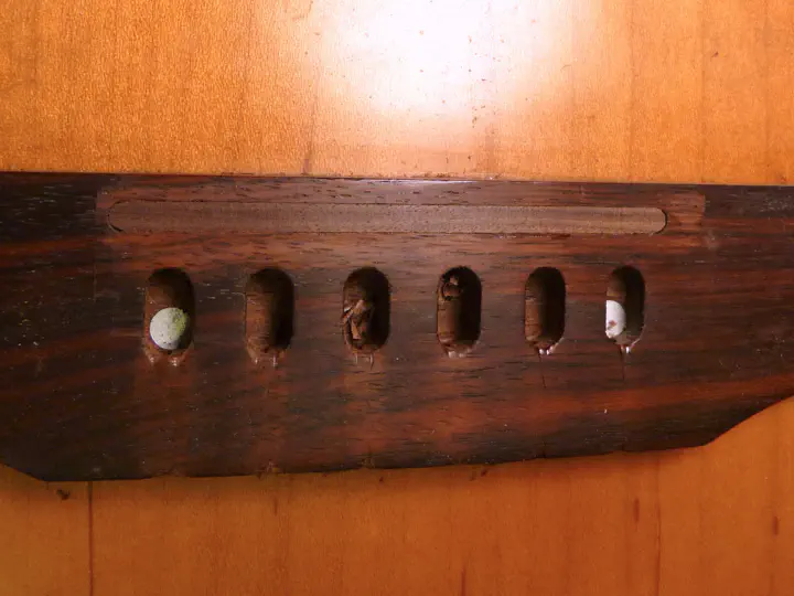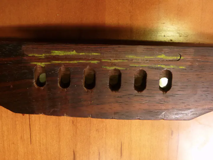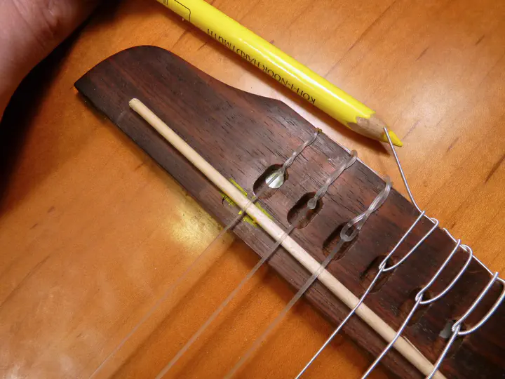 По слуху выставляю деревяшку так, чтобы флажолет на 12-м ладу и прижатая там же струна совпали по строю, после чего карадашом отмечаю позицию палочки. Карандаш очень удобный, купил когда-то для разметки на темной древесине, прусь.