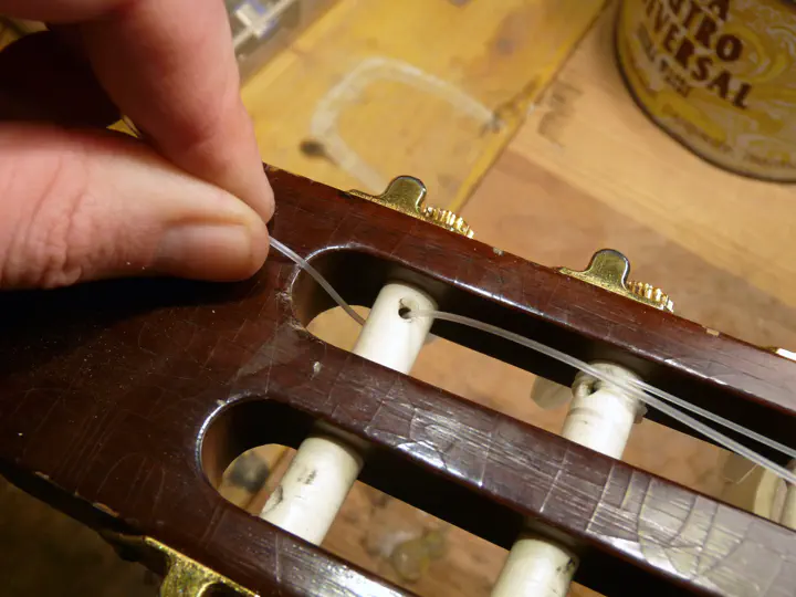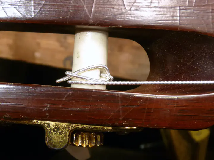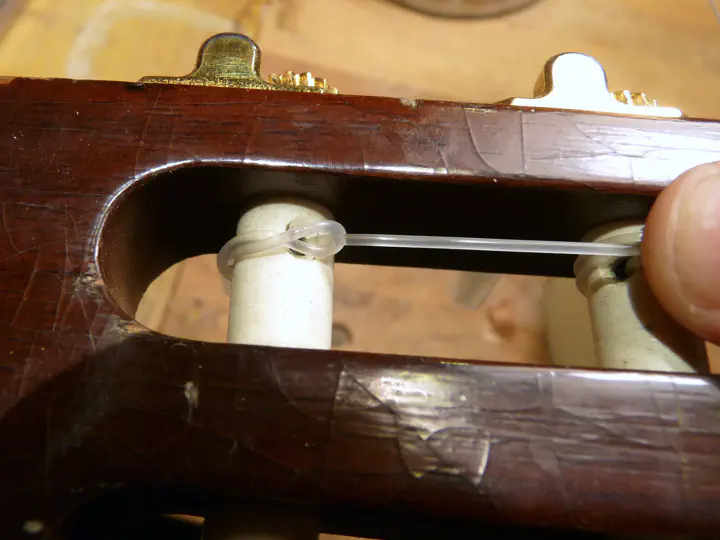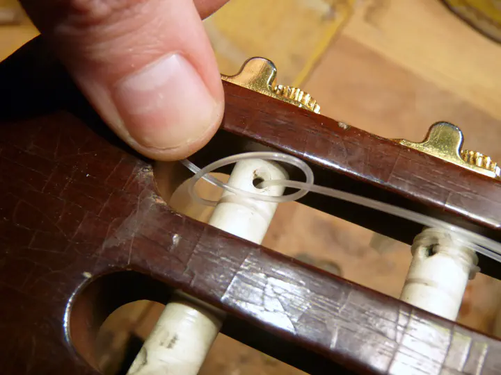 Сначала струна просто просовывается в отверстие и хвост вытаскивается наверх.