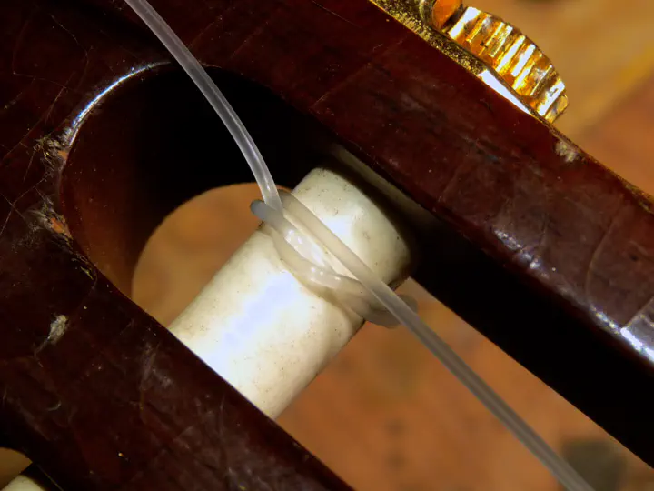 Витки струны должны идти против натяжения. На большинстве классических гитар каждая из струн стремится уползти по валу колка в сторону, обычно к центру головы грифа, — этому надо мешать. Тогда все витки будут плотно прижаты друг к другу, что хорошо сказывается на стабильности строя: