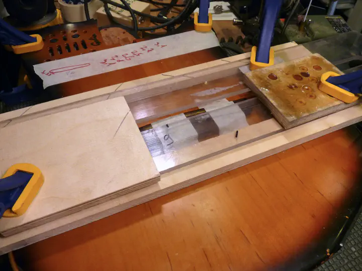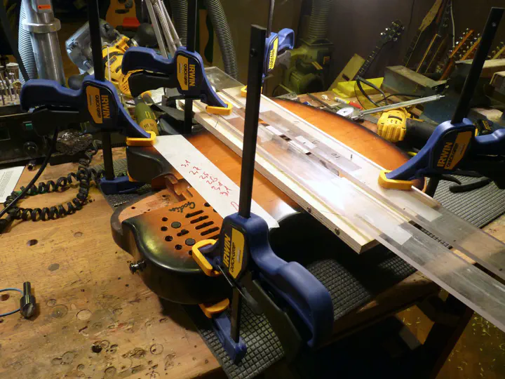 Фанера и поликарбонат фиксируются парой струбцин, а остальные две нужны только для того, чтобы корпус не наклонялся.