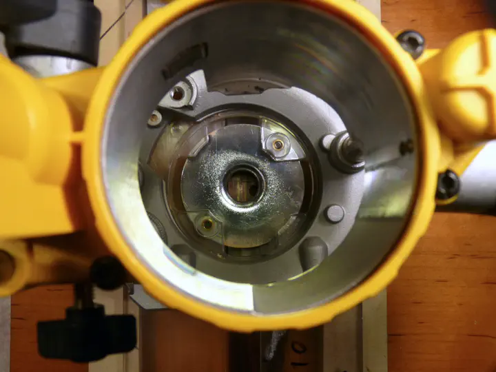 Если вынуть фрезерную головку из базы, легко через втулку отследить нужную позицию шаблона. Желтые линии должны быть посередине: