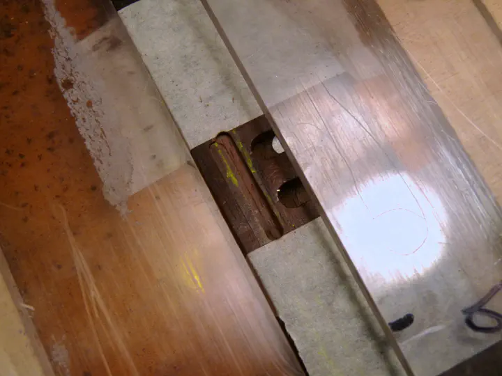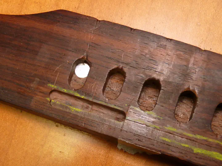 Делаю дополнительный проход для первой струны — паз под нее чуть глубже. Можно заметить, что на правом краю дна паза деревянную вставку уже не видно. Так и должно быть, потому что родной паз был радиусный, а тут шесть отдельных прямых, но с той же средней глубиной на каждом отрезке. Т.е. в идеале один край каждого порожка стоит на вставке, а другой — на голой деревяшке.