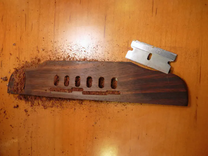В принципе, можно улучшить ситуацию, отодвинув гриф от подставки на миллиметр (гриф прикрученный, дело нехитрое). Но фишка в том, что струны требуют разной длины мензуры, и увеличить ее везде одинаково — недостаточно. Значит, придется перефрезеровывать паз в подставке.