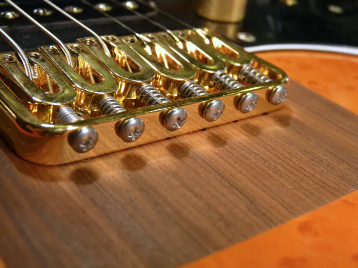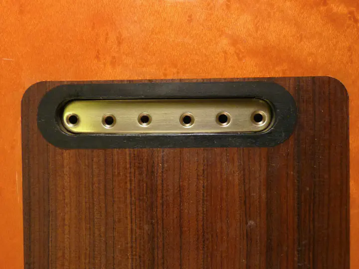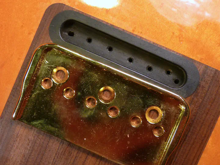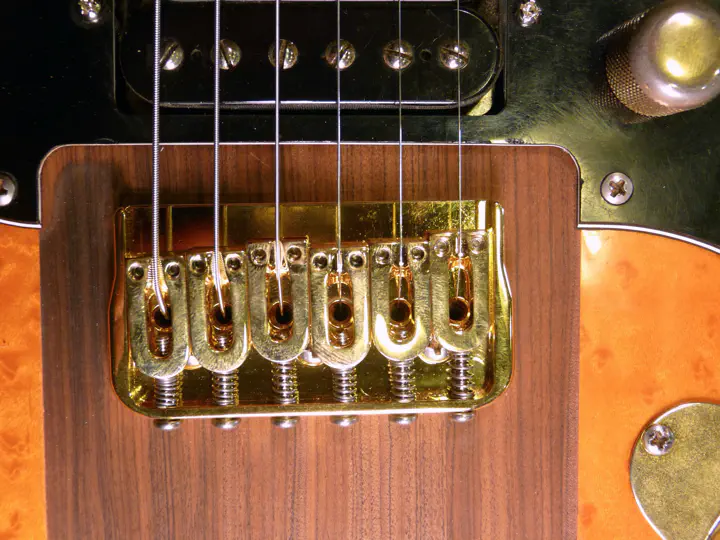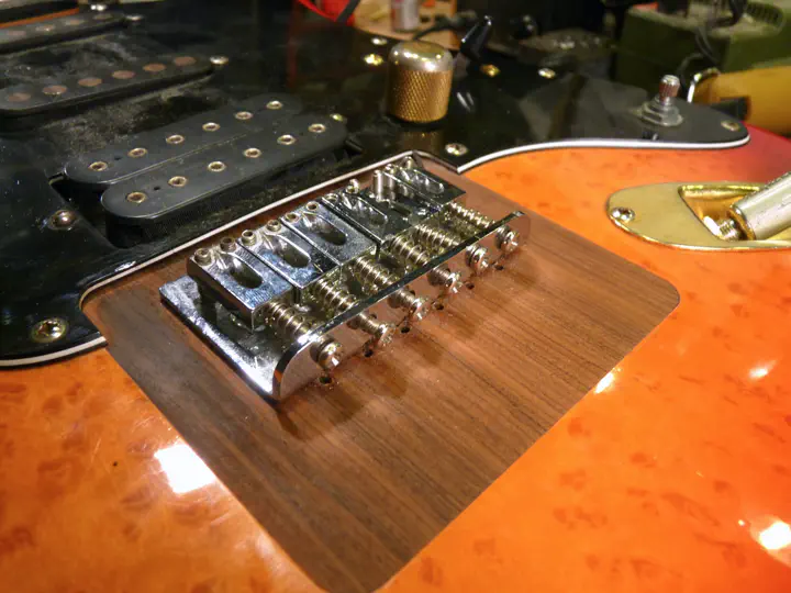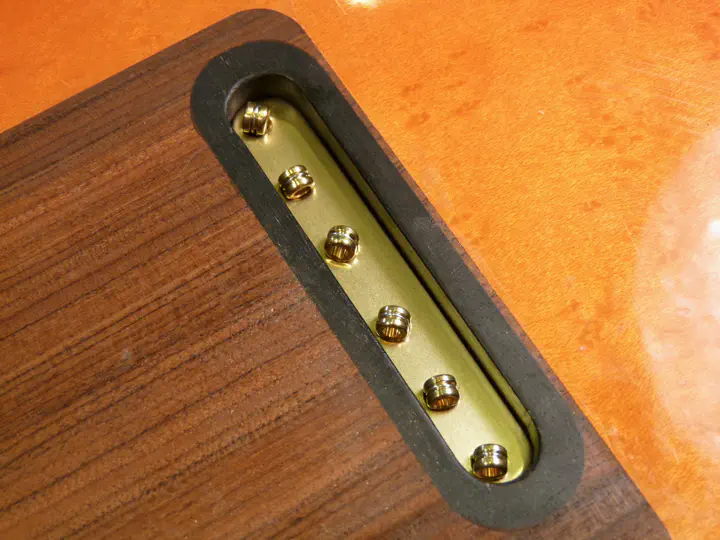 Вместо стандартного string-thru бриджа, типа GTC-102 и аналогичных, мастер установил так называемый top-loading бридж, в котором струны крепятся не через корпус, а прямо сверху.
