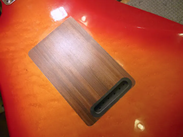 Попробуем разобраться. Сначала на этом японском страте стоял флойдроуз. Затем его удалили, а посадочное место заколотили палисандром (точнее, пау ферро, но у нас оно обычно называется “палисандр сантос”). В такой модификации ничего особенного нет - хотя в данном случае гораздо правильнее было бы найти новый корпус, я считаю.