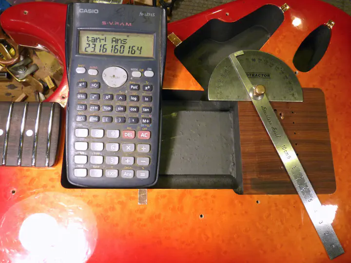 Дальше пришлось вспомнить школьный курс тригонометрии. Зная расстояние по горизонтали от старых отверстий до новых, а также длину вертикали от точки входа струны до точки выхода, несложно рассчитать искомый угол диагонали. Проверил протрактором - сошлось: