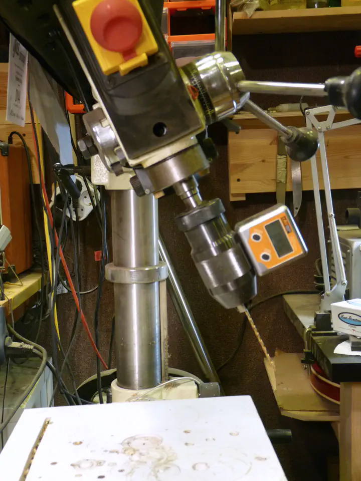 С этим отлично справится мой станочек (JDR-34). У него поворачивается весь сверлильный блок. Некоторую трудность представляет точная регулировка угла, потому что штатная шкала станка для этого непригодна. Решение - цифровой угломер. Купил много лет назад за копейки. Эта штука очень выручает при настройке станков и при странных занятиях. Вот как сейчас. Угол отсчитывается от горизонтали, поэтому там что-то типа 66,6: