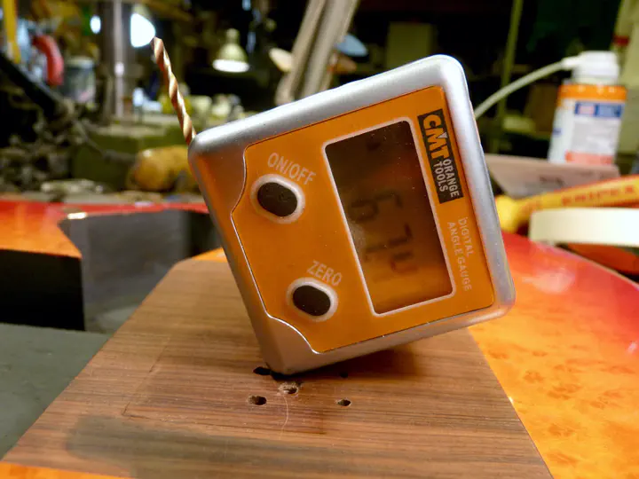 Точный угол выдержать не удалось ни разу, везде была небольшая поправка. Знак этой поправки позволяет предположить, в какую какую сторону сверло сдвинулось. Дополнительно уточнить это можно большой стопкой неодимовых магнитов со стороны выхода сверла - они хорошо чувствуют сталь в толще древесины.