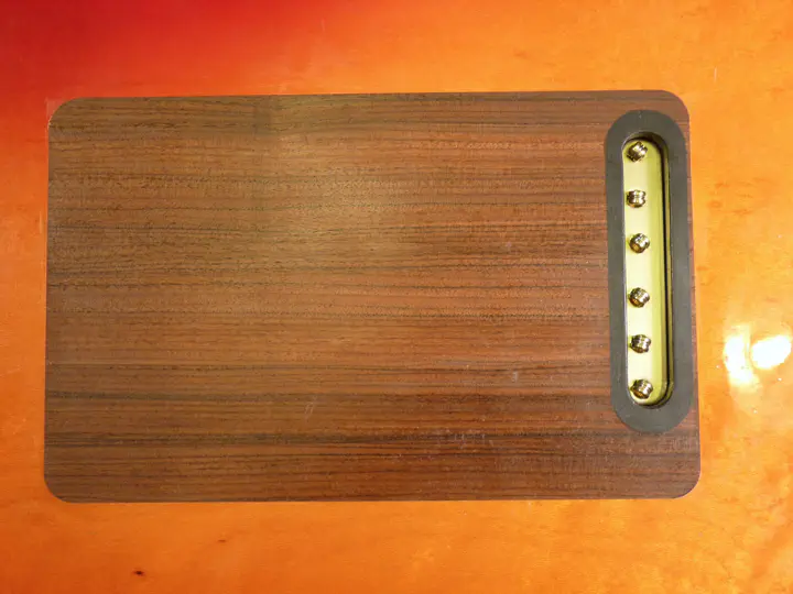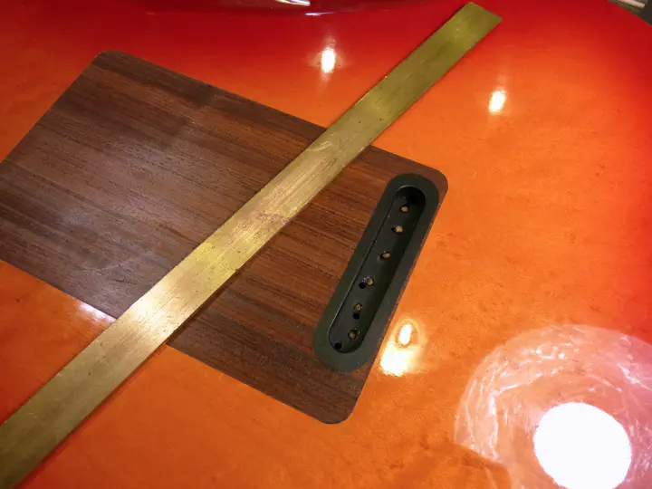 Латуньку я поставил не только для того, чтобы закрыть следы вмешательства. Я вообще считаю, что для электрогитары опора струны на древесину - моветон. Оставьте это акустикам. Латунная вставка достаточно прилично выглядит:
