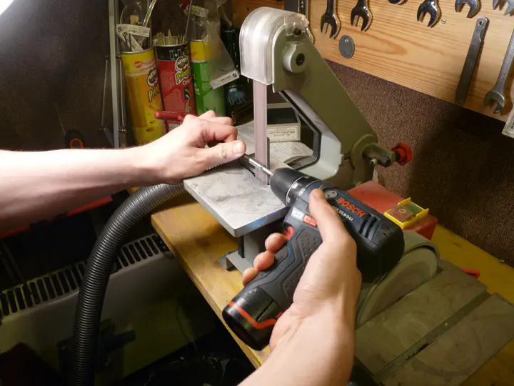 Время от времени с помощью шуруповерта делается что-то совсем странное, — например, на фото ниже я стачиваю с анкерной гайки часть толщины, вращая ее по движущейся ленте гриндера. Токарный станок категории Б.
