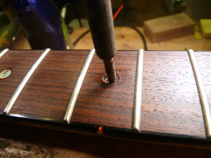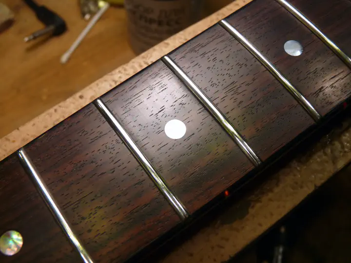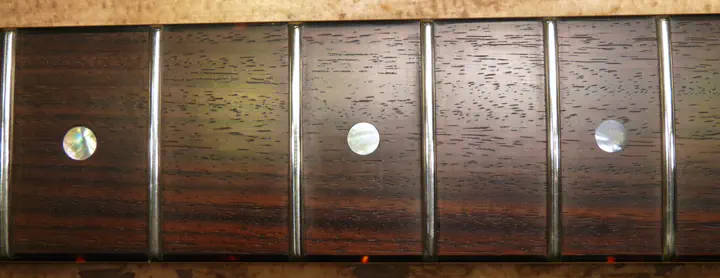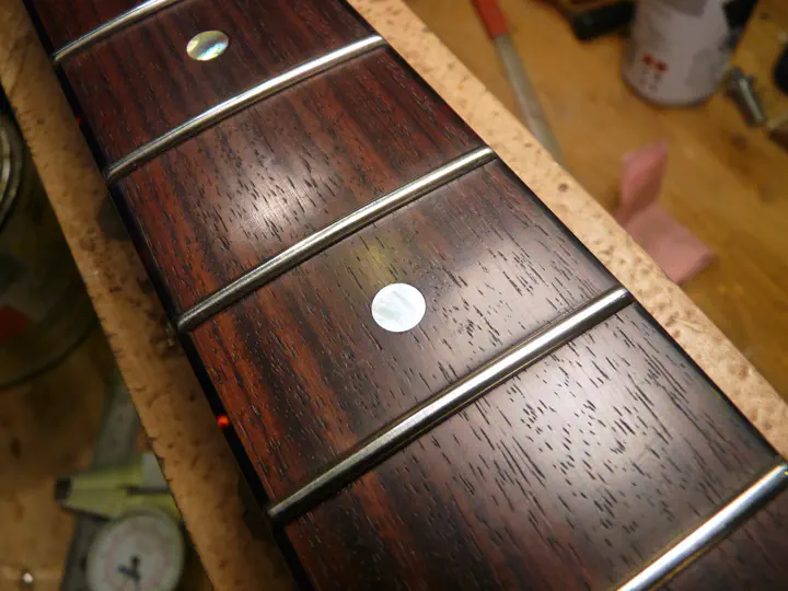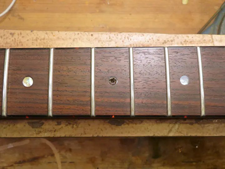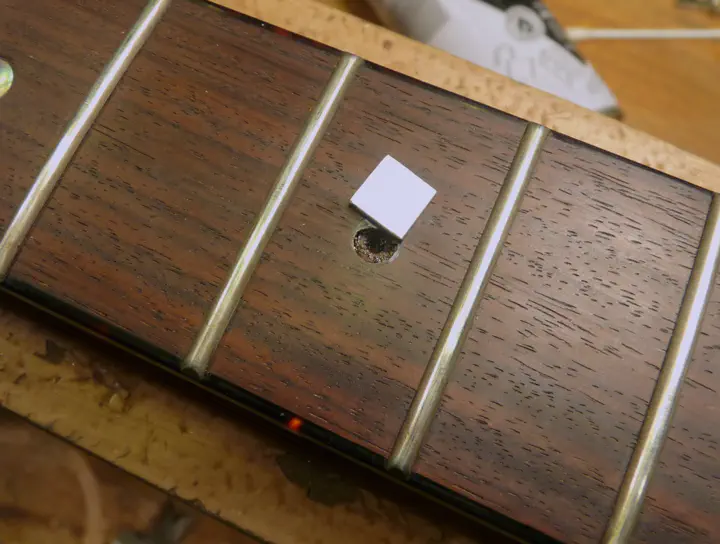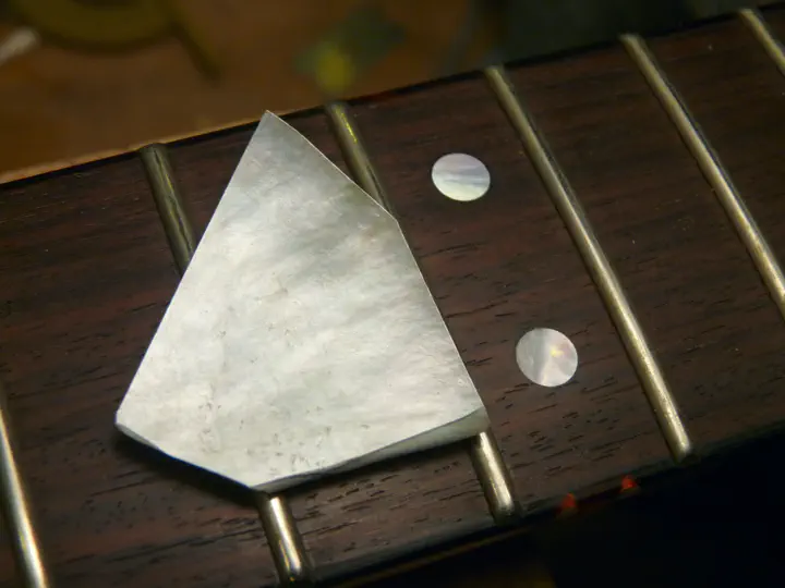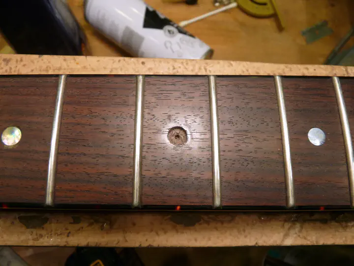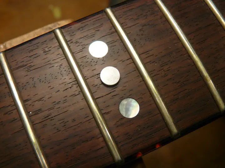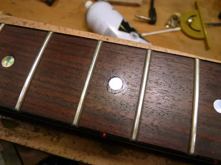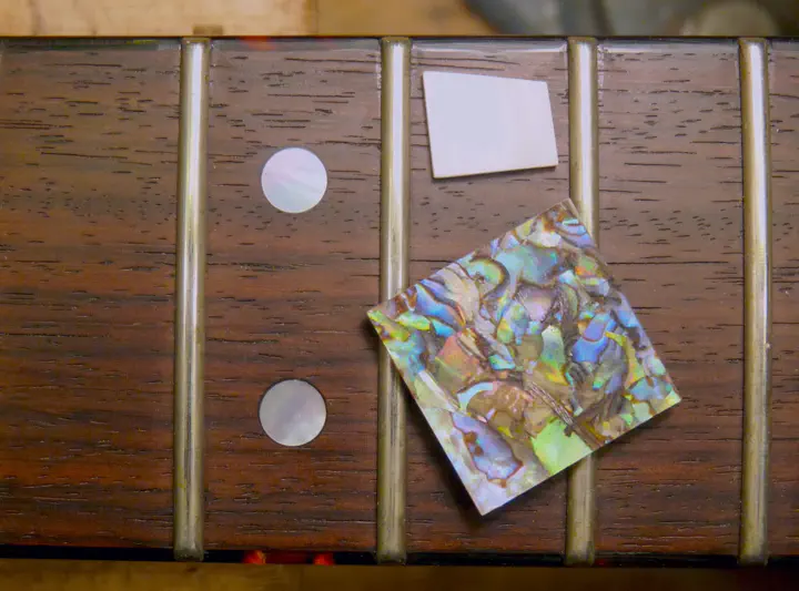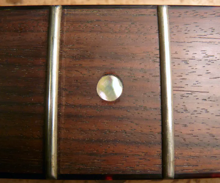 Да, у нее была не вполне круглая форма :-) Впрочем, соседнюю, левую, инкрустацию уже меняли, о чем свидетельствуют следы клея и царапины на накладке. Возможно, выпавшая тоже не была родной.
