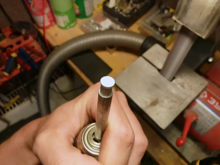 Рассверлить такую дыру, сохранив центр, сложно. Но в дереве-то круглое отверстие уже есть! Стало быть, нужно просто убрать клей. Подогреваю его паяльником, ошметки шкворчат и вылезают: