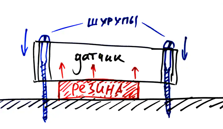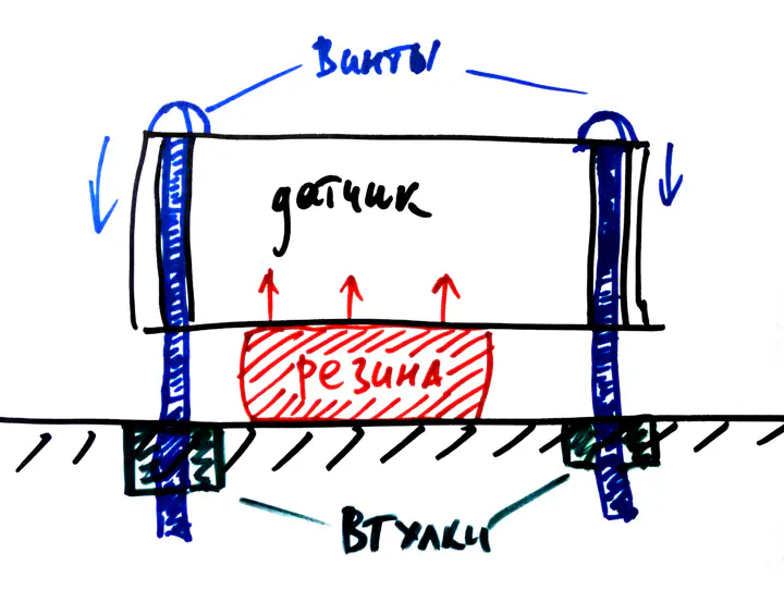 В корпусе датчика есть отверстия. Через них проходят длинные тонкие шурупы, которые вворачиваются в дерево и тянут датчик вниз. Под последний кладется либо резина, либо поролон, либо пружины — все это толкает датчик вверх, пока тот не упрется в шляпки шурупов.