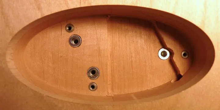 У такого крепления есть минусы. Минус первый: шурупы используются тонкие, а их длина ограничена толщиной корпуса, поэтому в мягкой древесине часто срывается резьба. В принципе, толщина корпуса Колоссуса — 50 мм, побольше джазбаса… Только вот где найти удлиненные шурупы, чтобы использовать это преимущество?