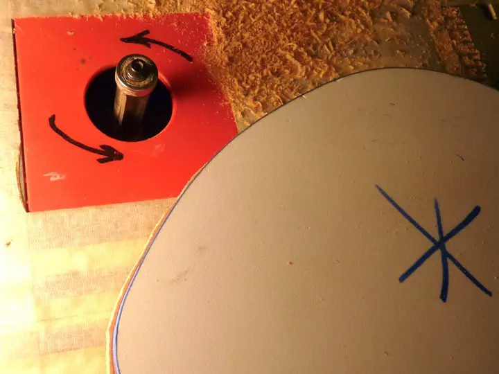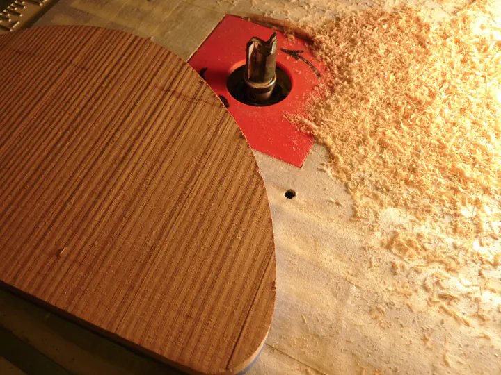 Проблема одна. Стандартная фреза очень плохо идет по восходящей кромке детали; на верхней фотке как раз такой случай. Нож фрезы вклинивается в волокна древесины, раскалывает тоненькую дощечку и отправляет ее в полет по мастерской. Я так убил две заготовки, прежде чем сообразил, что для прохода по сложному месту можно поставить фрезу с верхним подшипником и перевернуть шаблон. Вот так — безопасно, потому что нож входит в заготовку не параллельно волокнам: