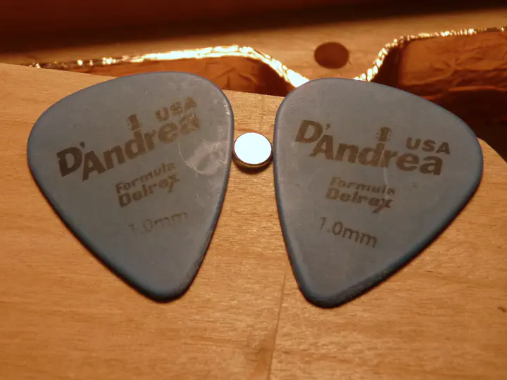Как вставить магнит не полностью, чтобы он торчал ровно на миллиметр? Элементарно: выкопать ямку под плотную посадку, положить с двух сторон по медиатору нужной толщины и жахнуть молотком.