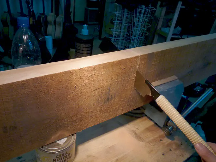 Все эти вещи выходят за рамки рассказа об изготовлении баса. Упомянул я их, чтобы чтобы донести главное: не следует использовать совсем свежую древесину, ее гарантированно поведет при “зимней” влажности (20-30%). Продавцам, которые заявляют об идеальной сухости своей древесины, тоже лучше не доверять. Если вы гитарничаете дома, то никуда не торопитесь и дайте деревяшкам отлежаться хотя бы одну зиму — при условии, что она у вас суровая, — чтобы потом не строгать гриф. Сухости древесины следует уделить большое внимание.