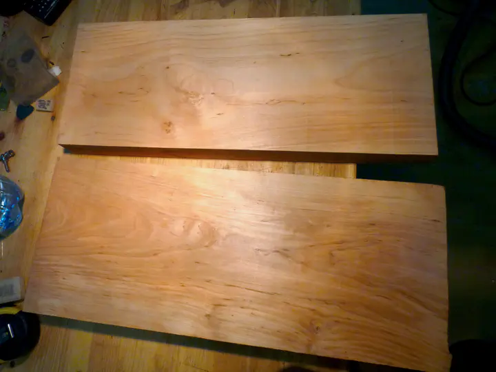 С топом было хитрее. Хороших кленовый досок нужной ширины (под распил книжкой) у меня в запасах не нашлось, и в Химках тоже. Утомившись, я заказал их в “мюзиквуде”. Два раза. Почему два — еще напишу.