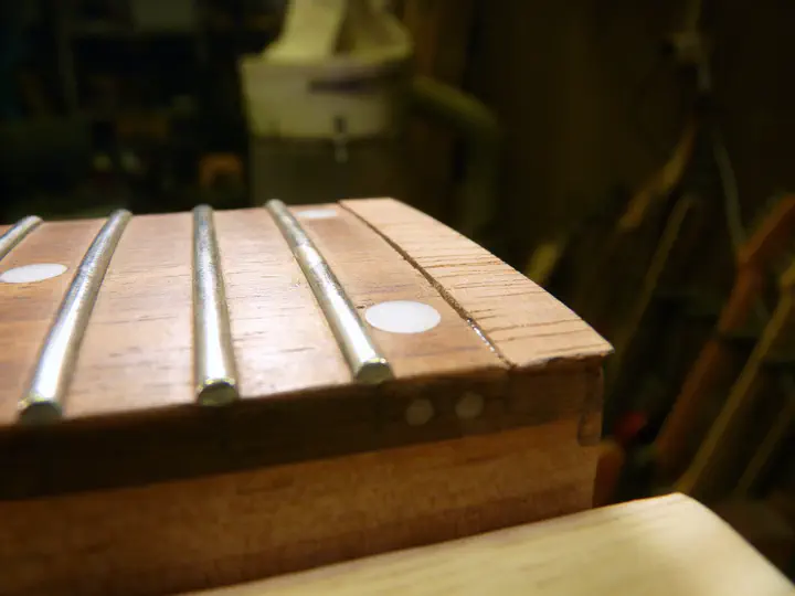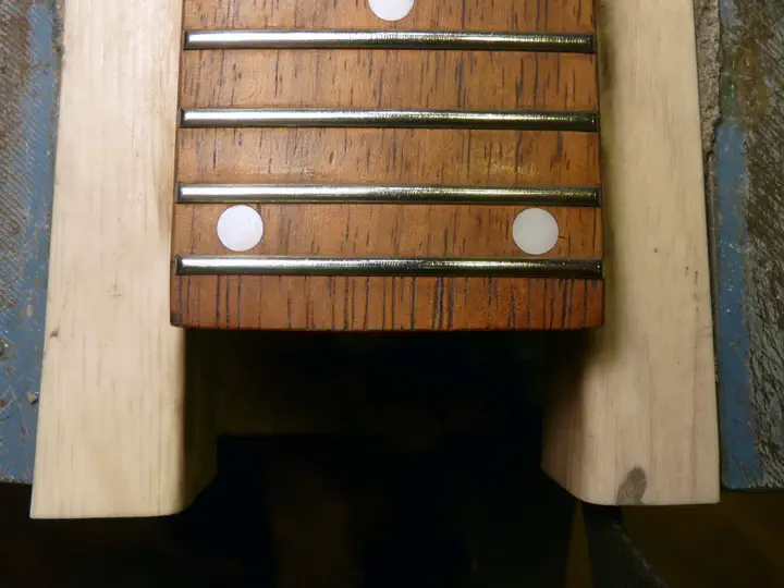 Осторожненько вынимаю лад — он еще пригодится. Устанавливаю на гриф подходящий радиусный брусок и вдоль его торца снимаю древесину напильником (точнее, razor file):