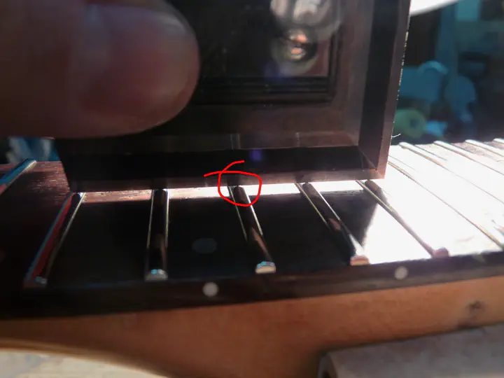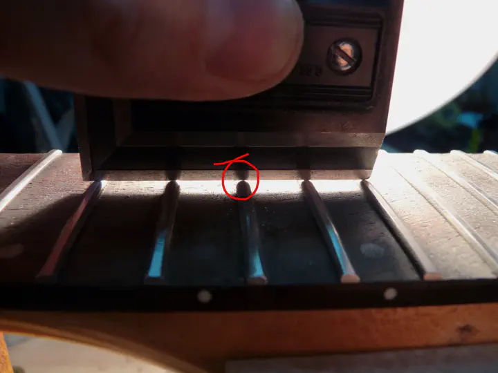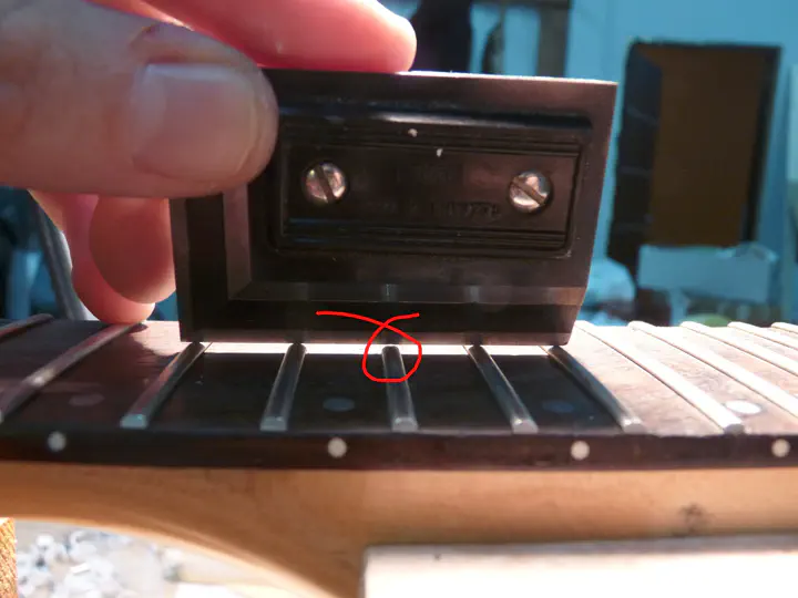 Опасения подтвердились: он существенно ниже соседей. Что делать? Если бросить как есть, струна будет сильно дребезжать на этом ладу (задевать о следующий). Можно сточить все остальные 23 лада до уровня одного-единственного низкого, но тогда от них мало что останется, да и шлифовать-закатывать плоские лады запаришься. Но есть и третий вариант, очень простой.