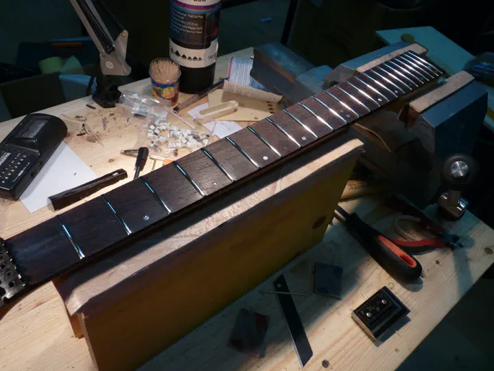 Теперь “низкий” лад поднялся чуть выше соседей. Сточить его — дело нехитрое. Но сначала его нужно жестко зафиксировать в дереве самым текучим суперклеем, потому что после перенесенных издевательств держится он не очень хорошо.