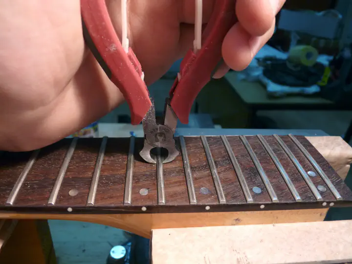 Очень осторожно подцепляю лад кусачками для извлечения ладов. Но не достаю его! Лишь слабо сжимаю ручки, чтобы жвалы кусачек залезли в щель и чуть-чуть приподняли центр лада над поверхностью накладки. Если перестараться, то лад действительно вылезет целиком, а это много лишней работы.