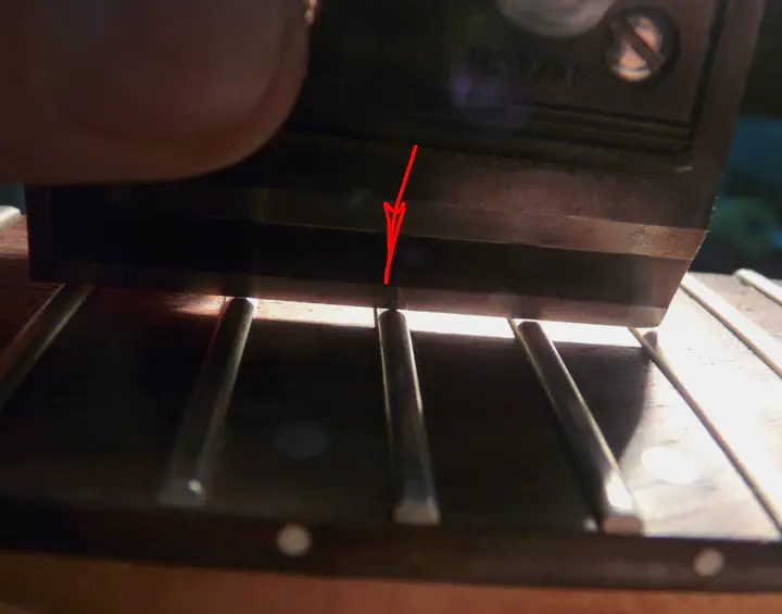 Хорошо видно, что центральный лад отшлифован только по краям, а середина осталась практически нетронутой. Веский повод проверить его высоту! Беру слесарный угольничек с идеально ровными сторонами: