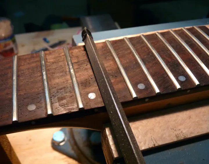 И финишно подшкурил бруском всю область, чтобы добиться идеального соответствия высот между соседними ладами: